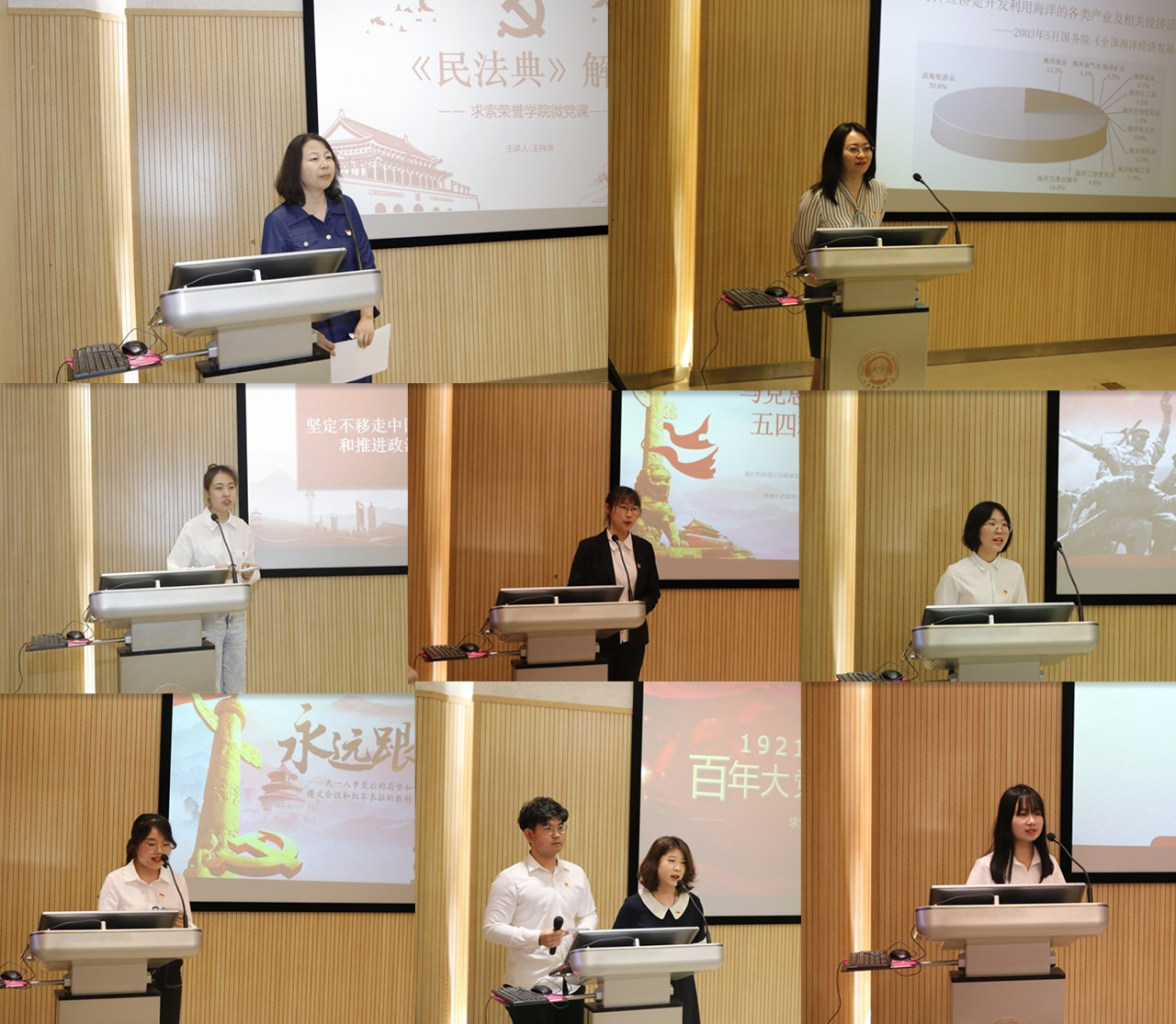 活动中,参赛人员围绕师生关注热点话题进行深入浅出地阐述,以小故事解读大道理,以小切口反映大主题。其中,6位同学以讲党史为主线,结合自身生活、学习经历,讲述了对五四精神、长征精神、抗美援朝精神、战“疫”精神及生态文明建设的深刻理解,展现了新时代青年胸怀崇高理想、立志建功新时代的精神风貌。王鸣华、涂清如两位老师分别以解读《中华人民共和国民法典》和海洋经济为主题,阐述了建设社会主义法治国家和建设海洋强国的深远意义。